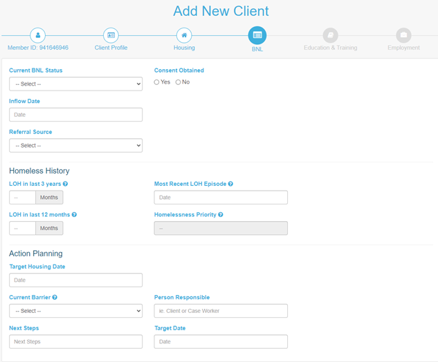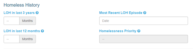 The second section of the BNL tab is Homeless History. This section is to assist with determining the homelessness priority of the client, based on their length on housing (LOH) at various times in their life.