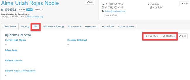 2. Within an existing client profile, by going to the BNL tab and clicking Set as Inflow – Newly Identified