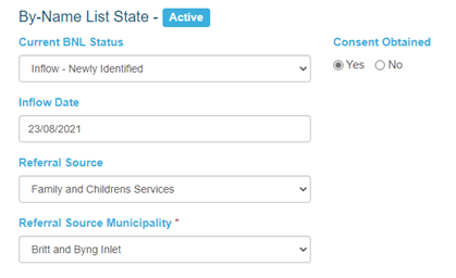 When a client is entering the program for the first time, the BNL status can be set to Inflow – Newly Identified. Here staff can enter the inflow date via a pop-up calendar modal, choose from a drop-down list of referral sources, and choose the referral source municipality from a drop-down list.