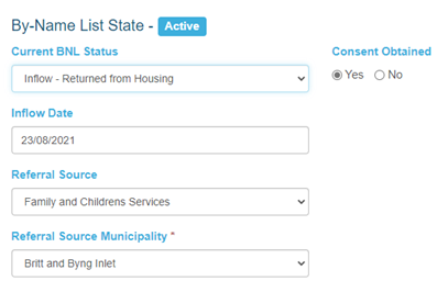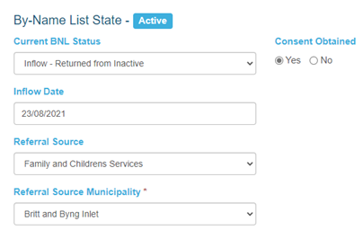 When a client is returning to the program after being inactive for a period of time, the BNL status can be set to Inflow – Returned from Inactive. Staff can enter the inflow date via a pop-up calendar modal, choose from a drop-down list of referral sources, and choose the referral source municipality from a drop-down list.