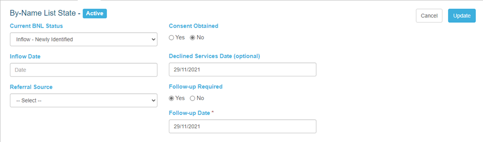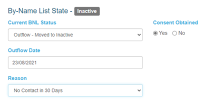 The first section of the BNL tab is the By-Name List status and state. This section establishes whether the client is in the process of entering the program, is returning to the program, or is exiting the program.