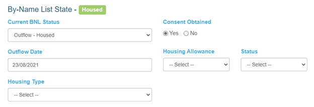 When the client has successfully found housing, the BNL status can be set to Outflow – Housed. Staff can enter the outflow date via a pop-up calendar modal and choose the Housing Type from a drop-down list.