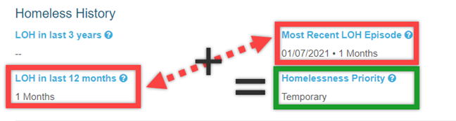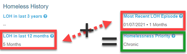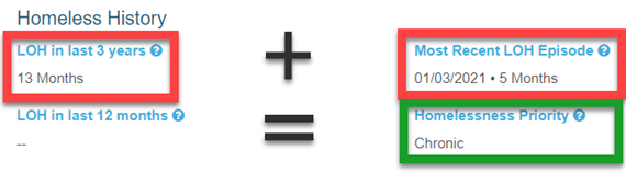 Based on an internal calculation the Homeless Priority will be set to Chronic, Approaching Chronic or Temporary. The calculations are as follows: