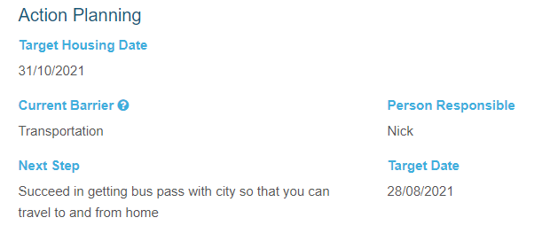The third section of the BNL tab is Action Planning. Here staff can set goals and next steps for the client.