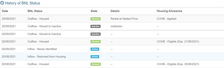 The final section of the tab is the History of BNL Status. Here staff will be provided with high level, at-a-glance information about the client. This includes: