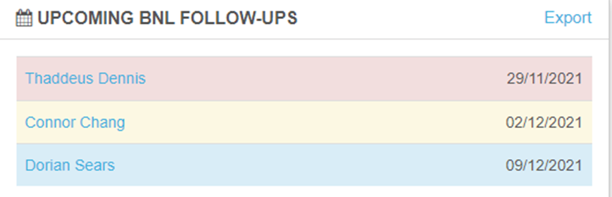 On the client profile tab and on the staff dashboard, a BNL Follow-Up indicator has been created with a colour warning system: