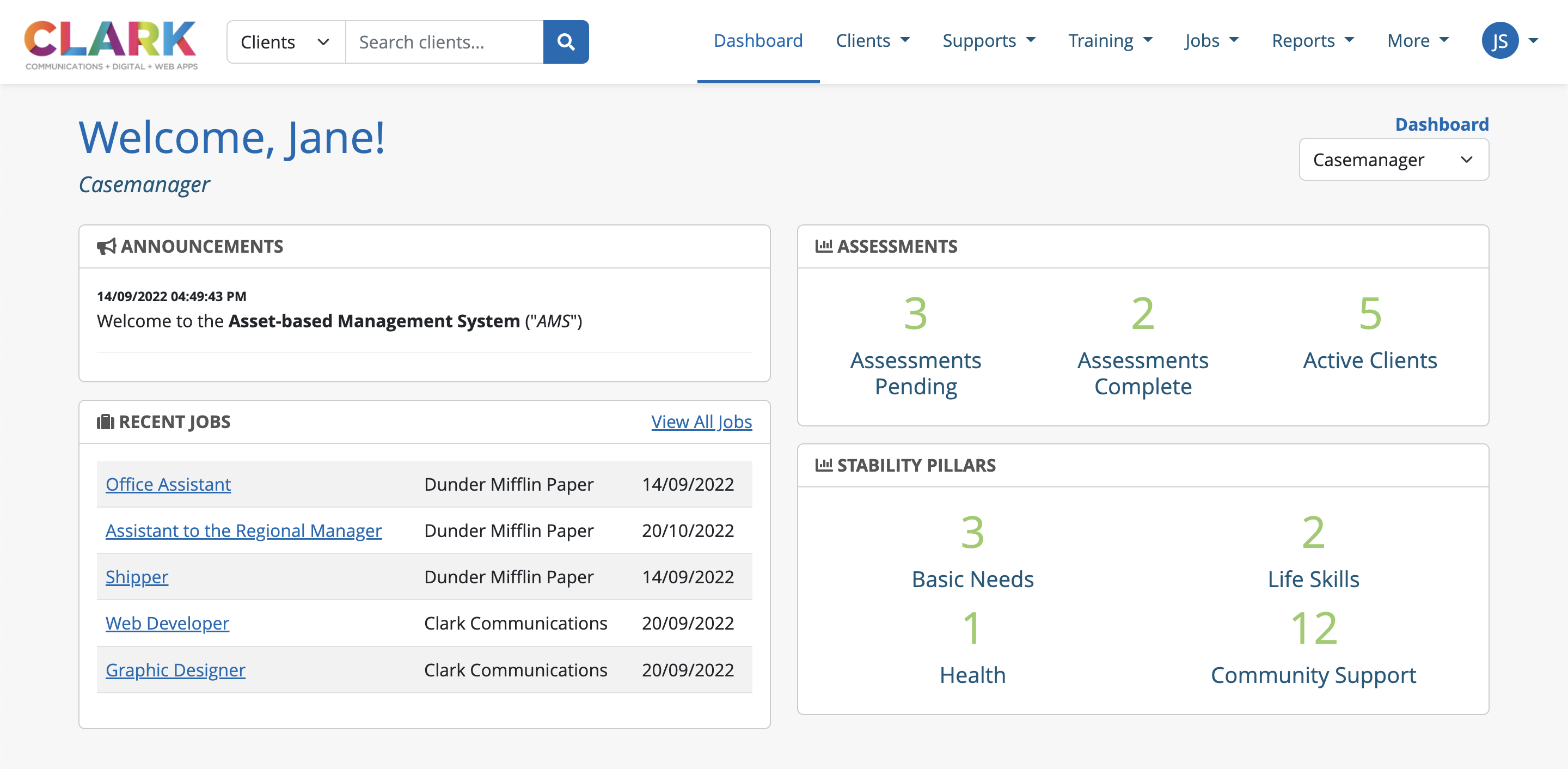 Each user type in the application sees a different dashboard, based on the information relevant to their role, and have been developed in the tool to provide users with a snapshot of activity related to clients, jobs and training in the system.