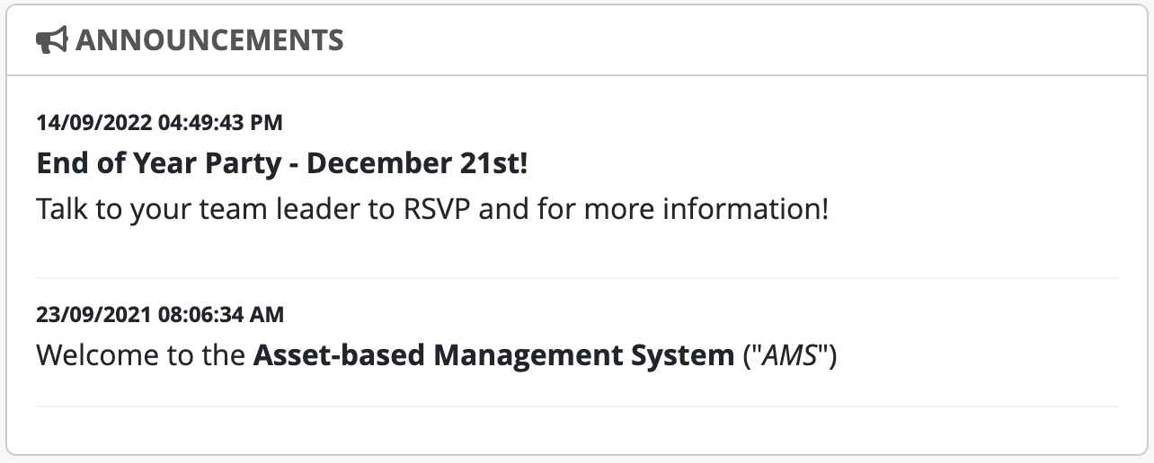 Displays information for users. Administrators can create and manage announcements in Admin Tools.