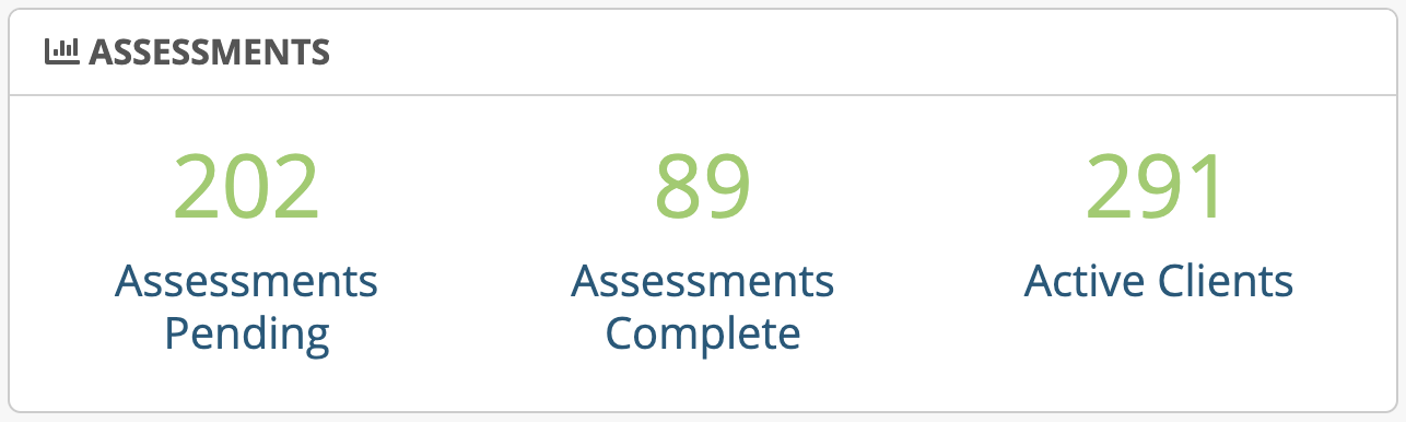 Displays the number of pending assessments, complete assessments and active clients.