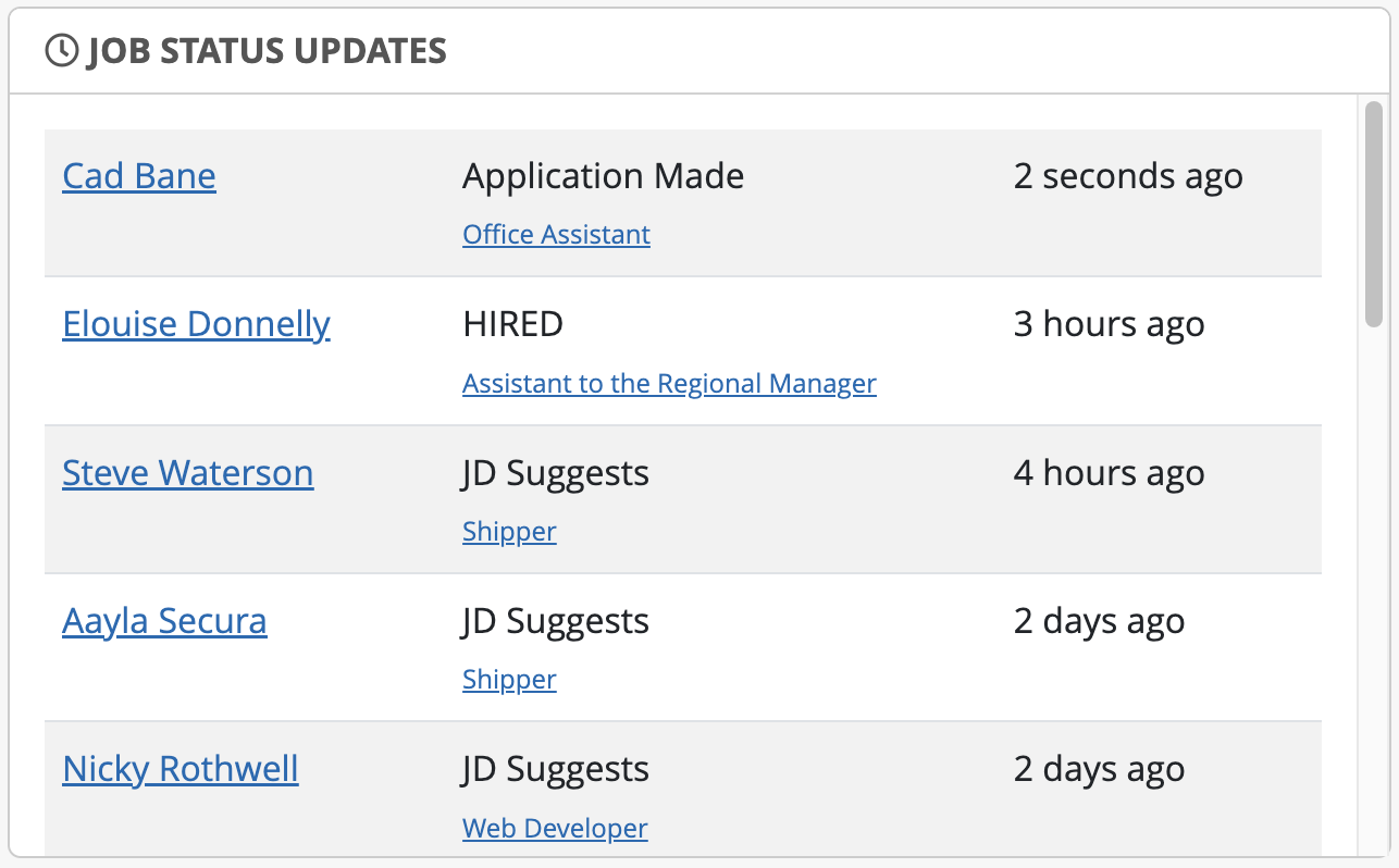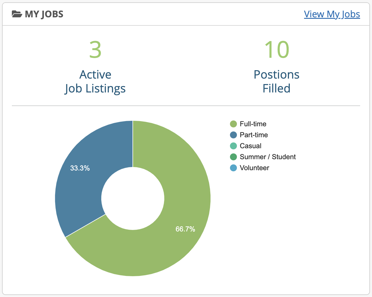 Displays the number of active jobs and total positions filled for jobs the staff user is responsible for managing. It also shows a chart with the percentage of job types for the active jobs.