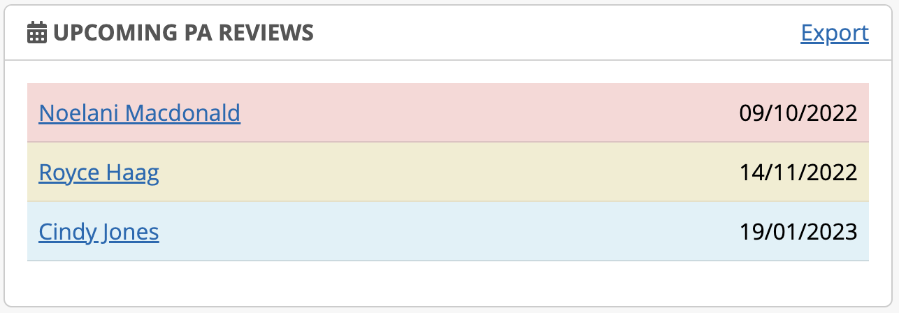 Displays clients with an upcoming PA Review, as indicated in the clients Employment Plan tab. Leadership will see a list of all client PA reviews, while casemangers will only see PA reviews related to their client list.