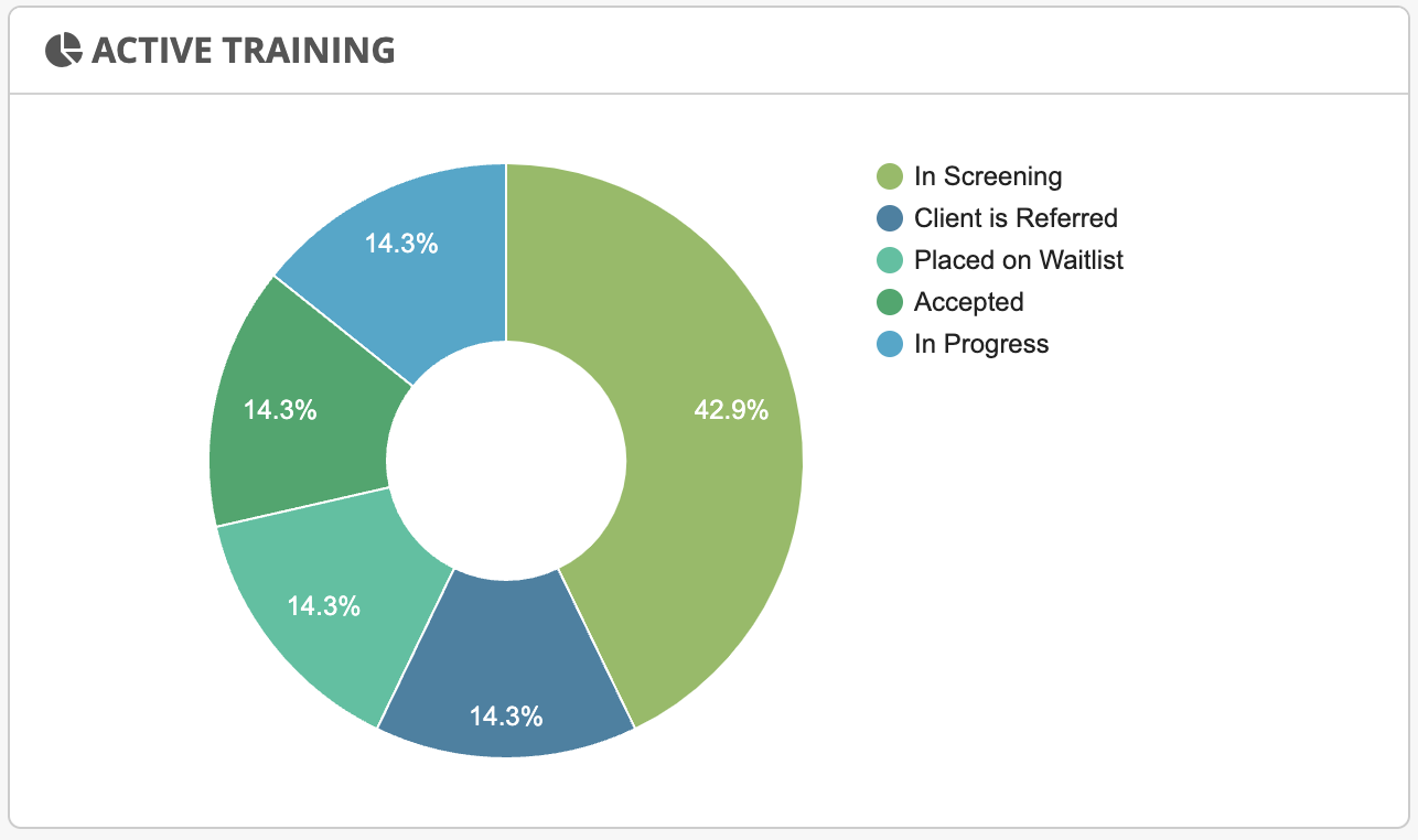 Shows a pie-chart with the percentage of clients in the caseload with a specific course status: In Screening, Client is Referred, Placed on Waitlist, Accepted, In Progress.