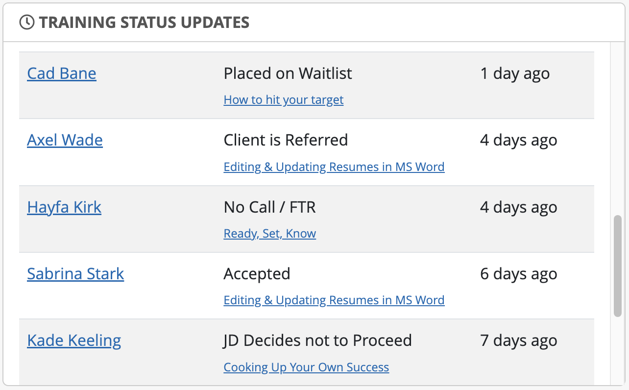 Shows training status activity for clients in the system, with links directly to either the case profile or training course profile.