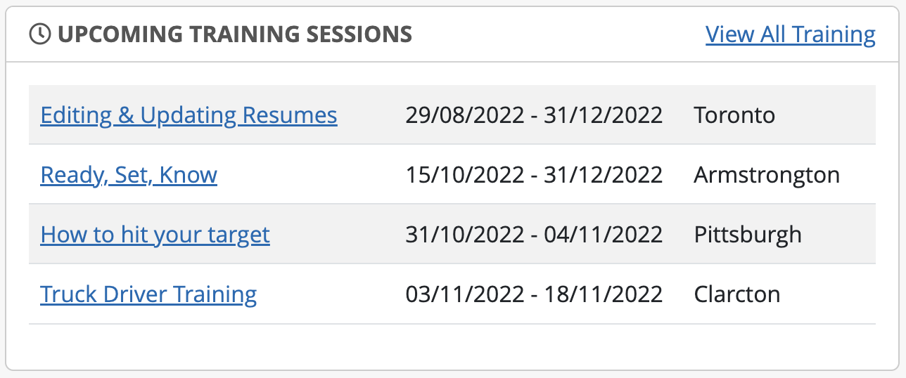 Lists newly added sessions to training courses with a link directly to each course.