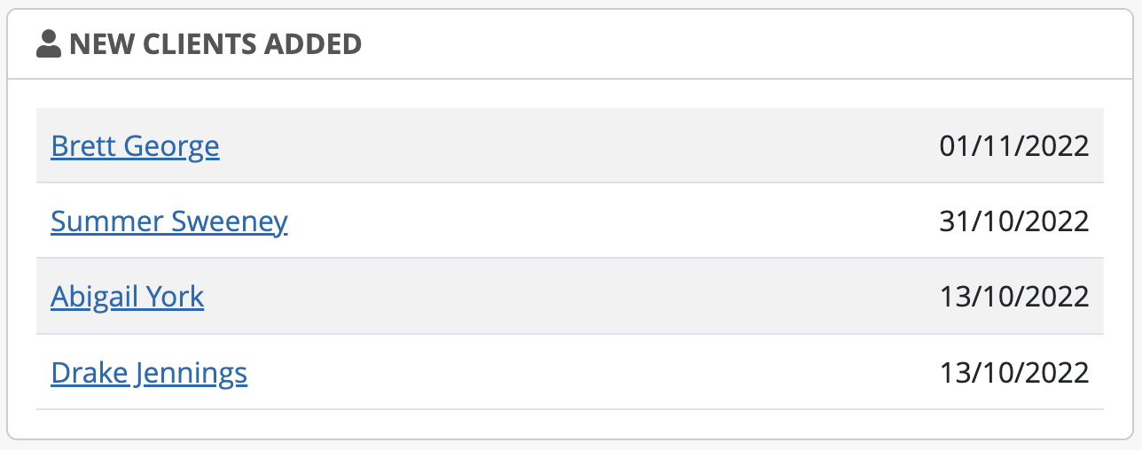 Displays a list of new clients that have been added into the system by client name and date added.