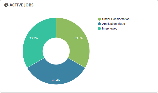 Shows a pie-chart and percentage of clients in the caseload with a specific job status: Under Consideration, Application Made, and Interviewed.