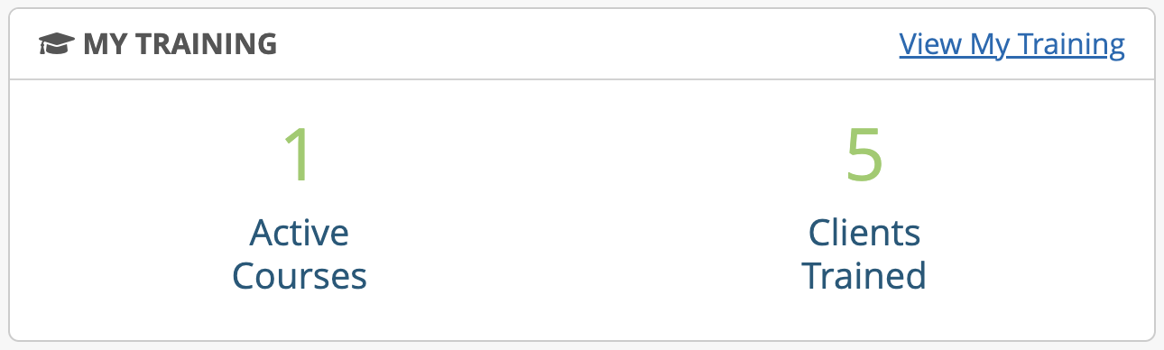 Displays the number of active courses and total clients trained for courses user is responsible for managing.