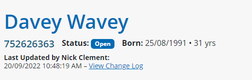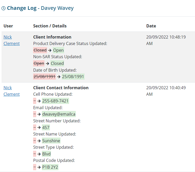 Users can also click on the View Change Log link, which opens a modal window, to see all the changes or updates associated to this client. When a change has been made to any client information, the previous state will be crossed out and highlighted red, and the new state will be highlighted green. A date and time stamp will also be marked on the right-hand side of the changed item.