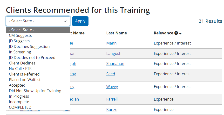 This tab lists all clients that have a current status for the training course, and users can toggle between seeing the clients in their caseload (My Caseload) or the entire caseload (All Clients).