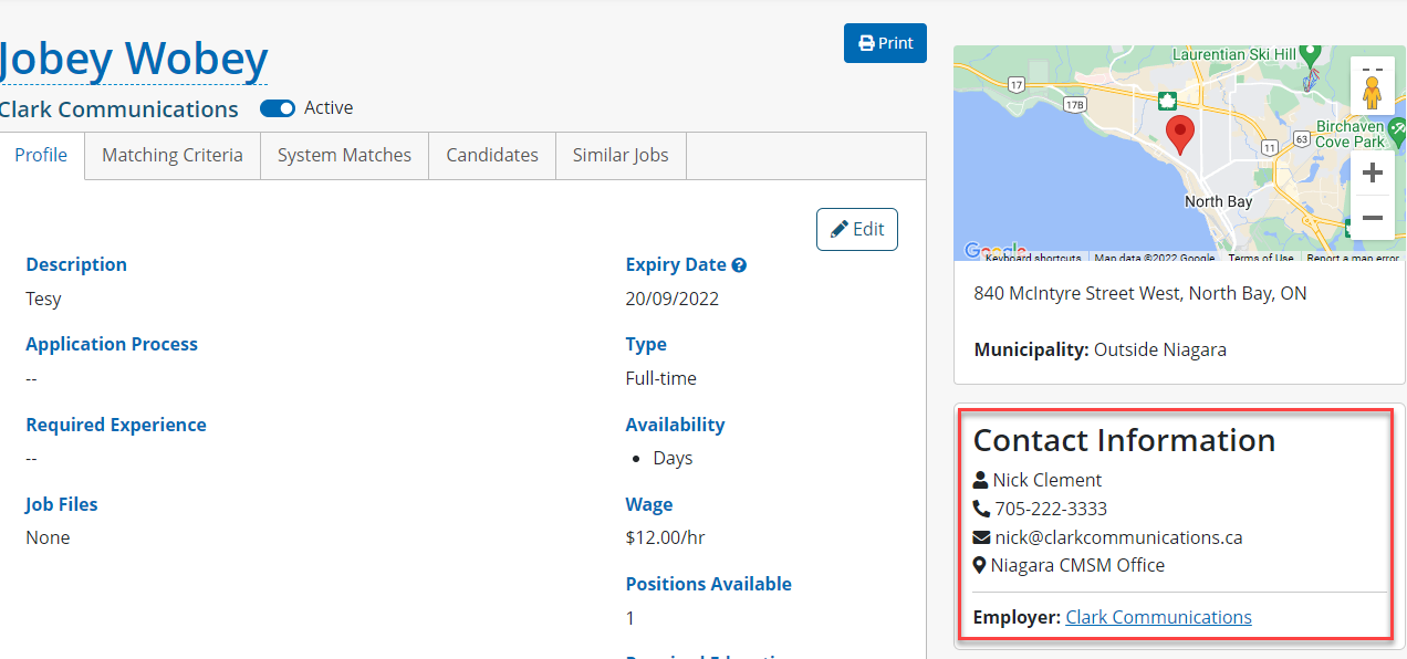 The Contact Information for the Job Developer managing this job post will be displayed, including the Employer offering the job, which links to the Employer’s Profile.