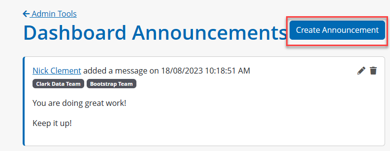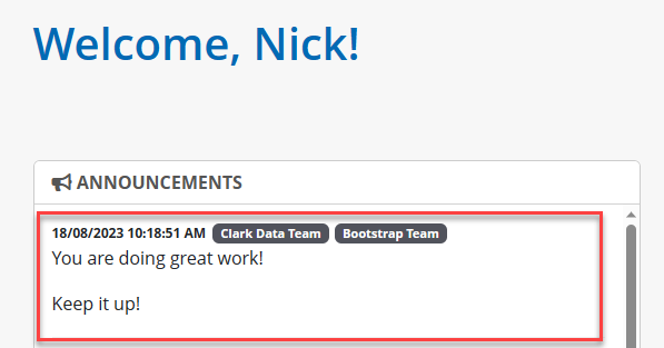 Dashboard Announcements allow Administrators to post important notices, updates or motivating messages for teams or individual user groups.