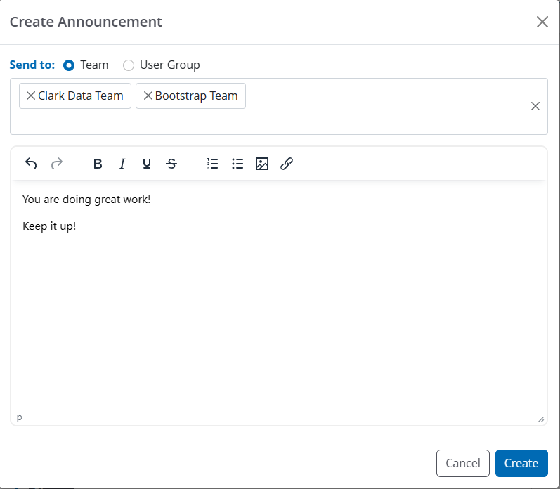 In the modal, users can select whether the announcement is for individual user group, or for one or more teams. Once created users can click the CREATE button located at the bottom of the modal.