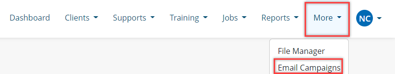 Staff can create an email campaign by clicking the More button in the navigation menu. Here they will see Email Campaigns. This will direct them to the email campaigns listings page.