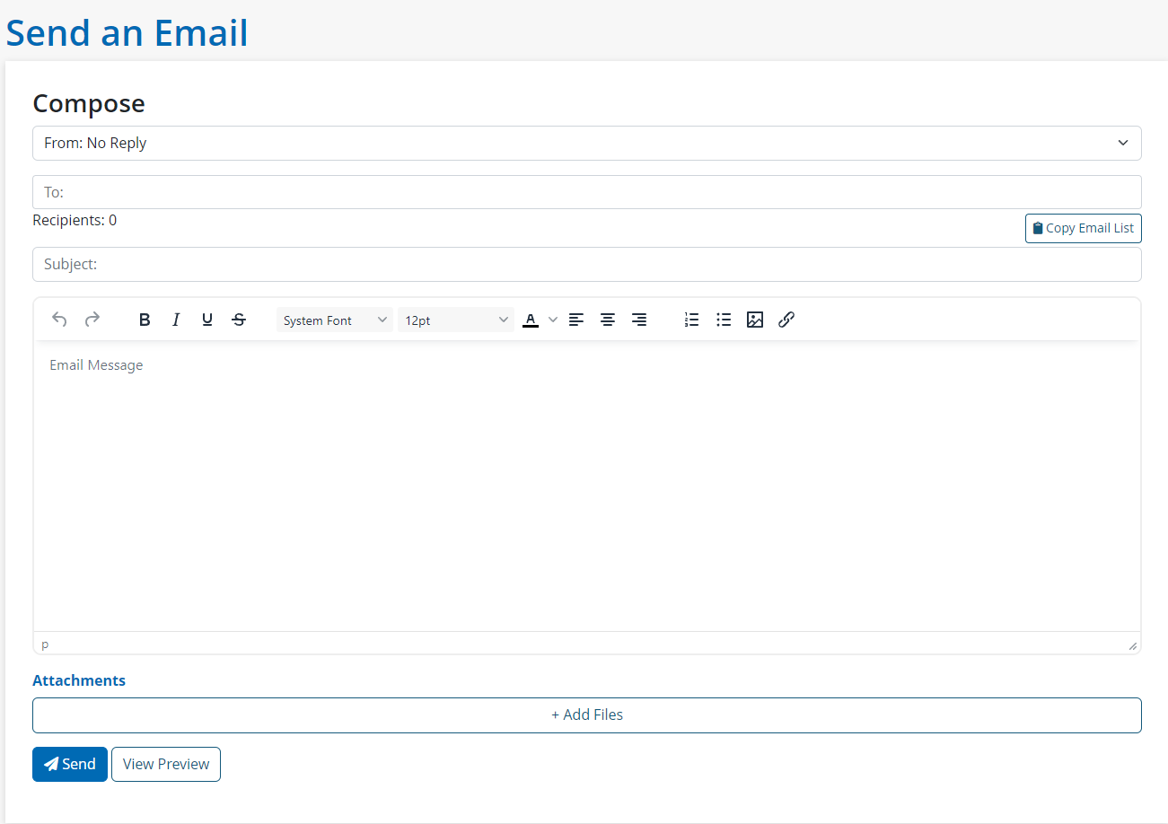 Once complete, staff can hit Send to email the campaign immediately, or select View Preview which will bring up a preview window of what the email will look like once sent.