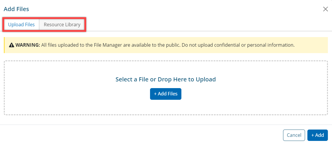 5. Add any file Attachments: By clicking + Add Files staff will be able to upload a new file for this email campaign, or attach an existing one using the file manager resource library.