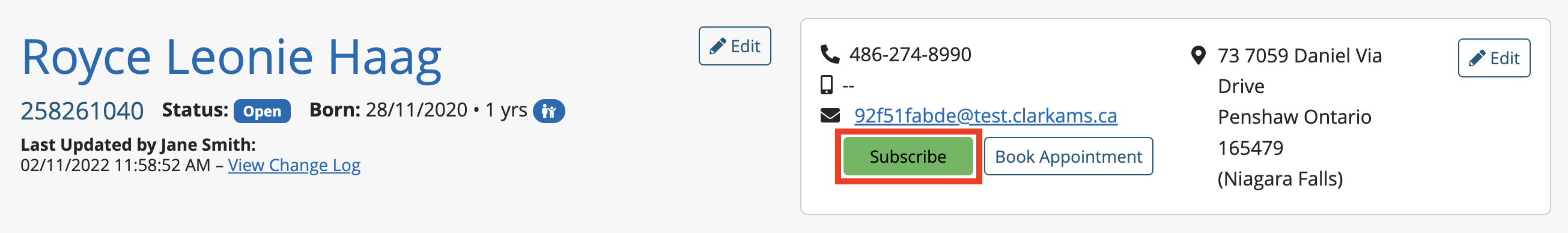 Should a client wish to re-subscribe, staff can go into the client’s profile and hover over the Unsubscribed button, located underneath their email address which will become a highlighted Subscribe.