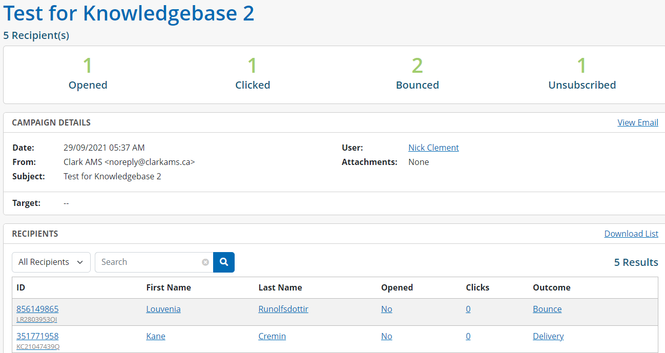 4. A list of recipients of the campaign: This includes their ID, first name, last name, if they opened the email, if they clicked a link in the email (if any), and the outcome.