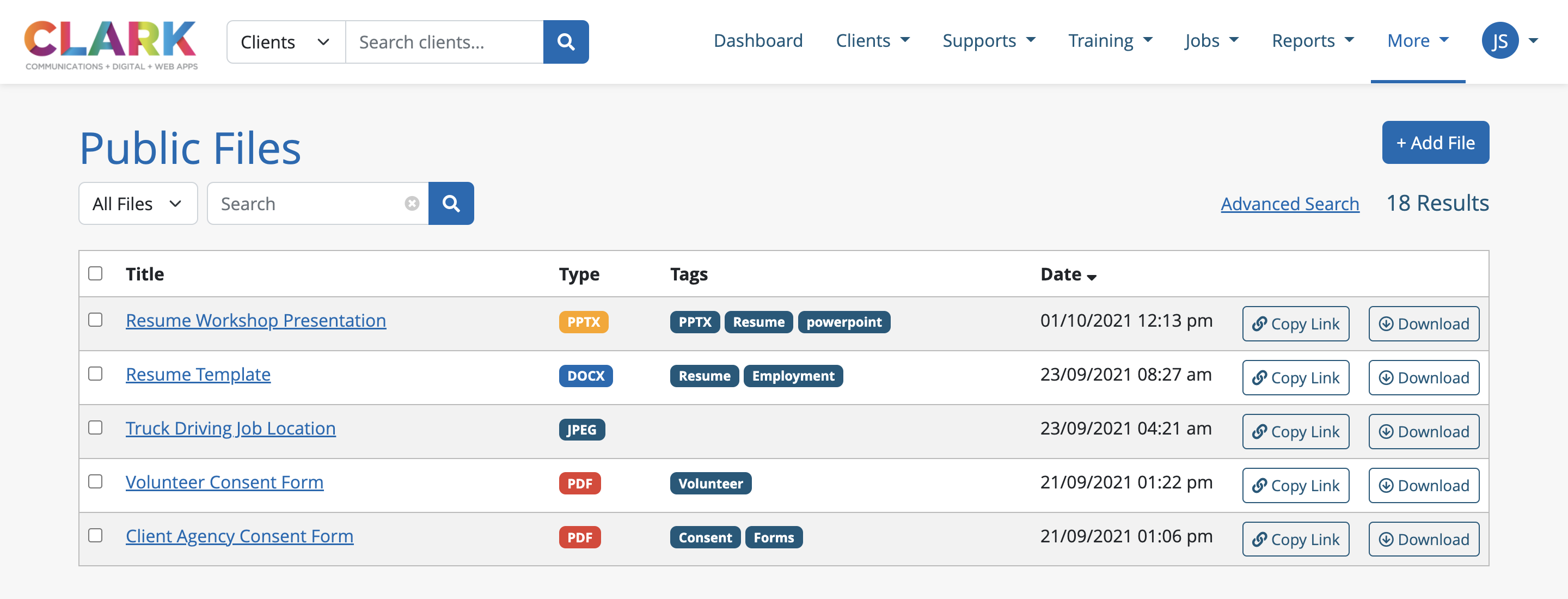 Within the listings page, staff can filter the list via All Files , or just their own via My Files. They can also use the keyword search to find the the title of a specific file, or use the Advanced Search to find a specific file type or tag associated to the file.