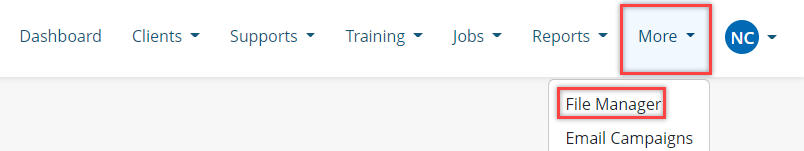 Staff can add files to the file manager by clicking the More button in the navigation menu. Here they will see File Manager This will direct them to the public files listings page.